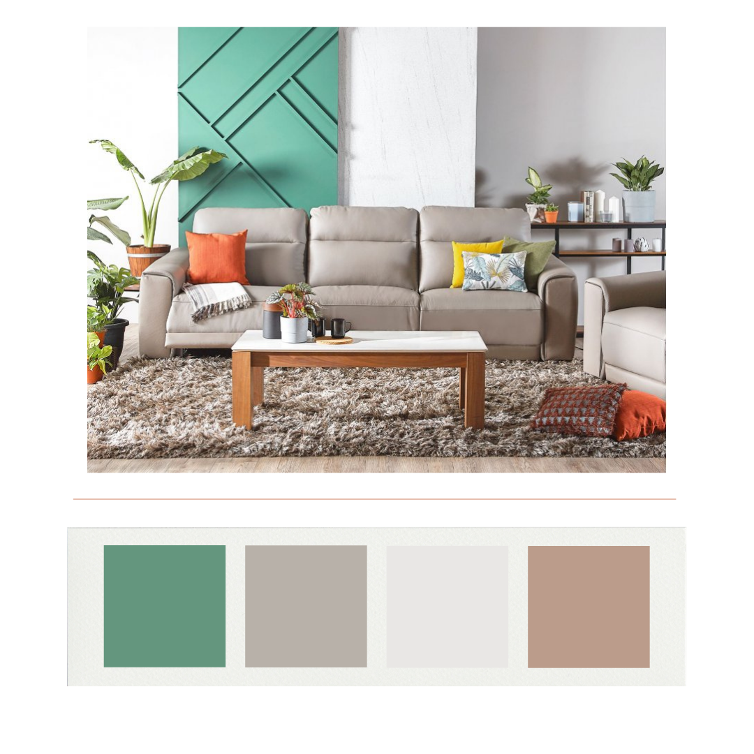 在白牆中嘗試部分區塊使用霧感的薄荷綠或是鼠尾草綠,加上米色或是灰色調沙發,空間看起來較明亮,並搭配木質感長方茶几或是扶手几,用幾盆綠色植栽點綴,除了保有現代感的簡約與寬敞外,更讓你的家看起來清爽、舒適,是大地色系的完美搭配。