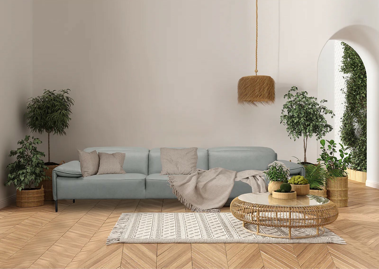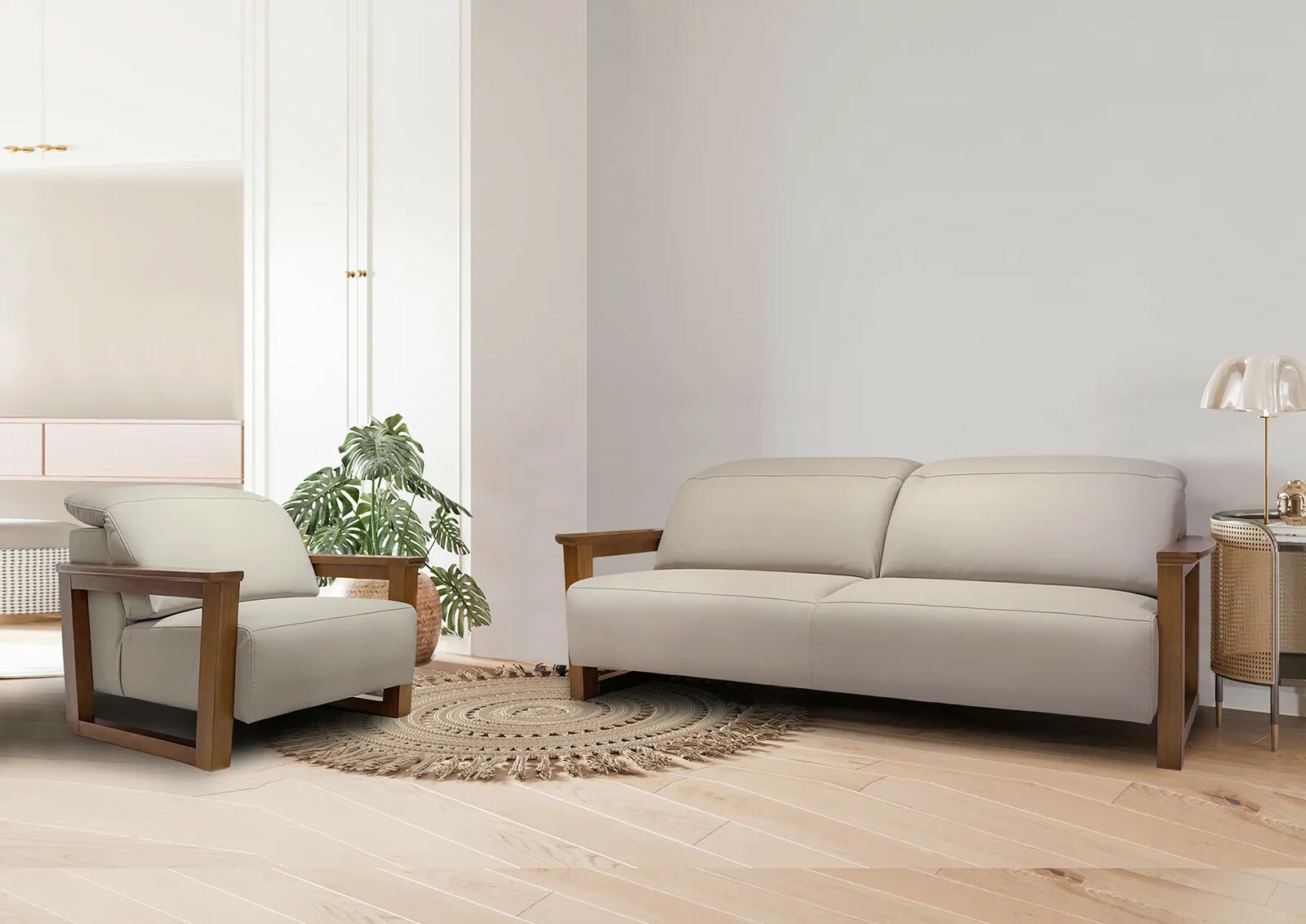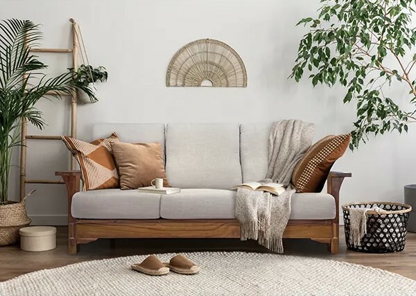 北歐風帶有一些簡潔、明亮與植物機能性設計,適合選擇白色調元素家具,營造減壓舒適的環境,Jalen柚木沙發組原料來自印尼頂級柚木,材質厚實耐用,米白色沙發布能為帶來居家柔和度假氛圍。