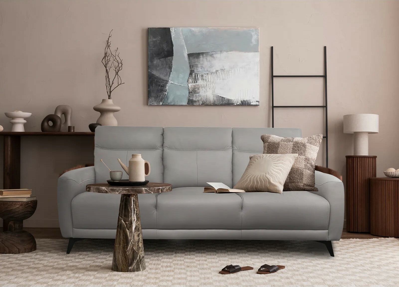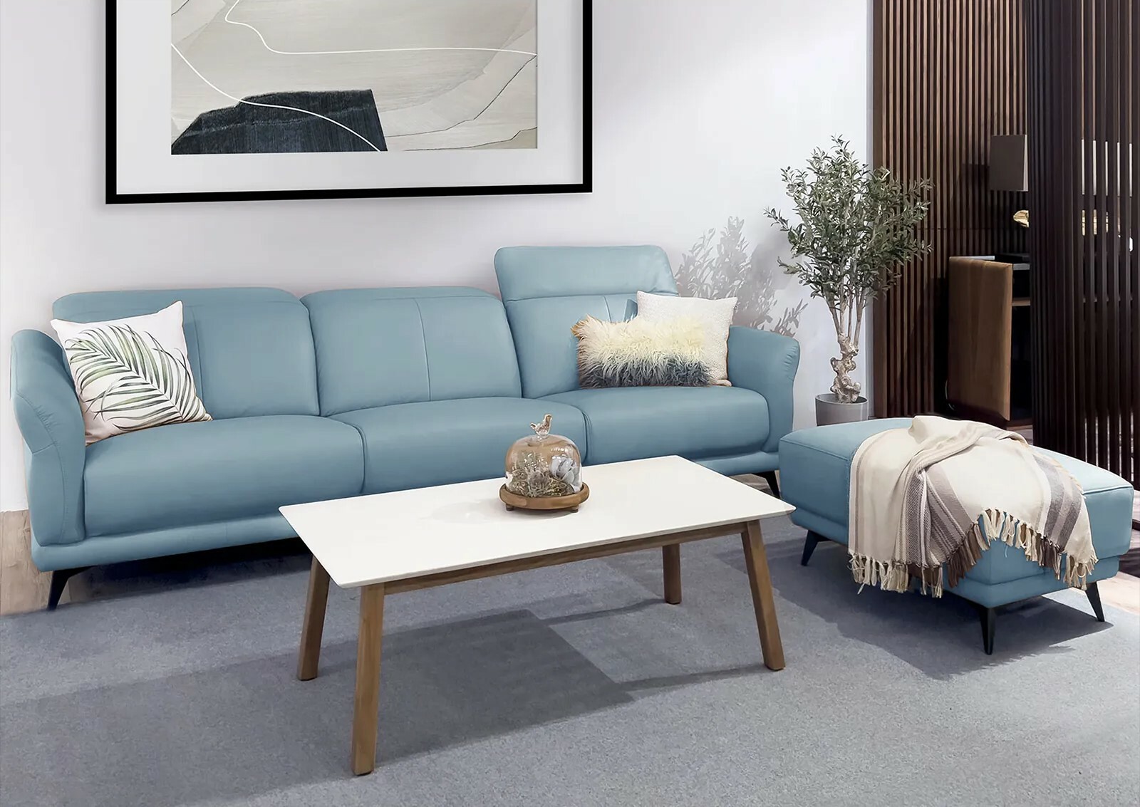 現代風格不受傳統框架限制,元素較新穎,用色相對來說也較為大膽,如何在空間的運用上跳脫出新的視覺設計,考驗著設計者的功力,Vinge全牛皮沙發以塵霧藍呈現清新和諧力,適合在原先的單一元素中,做出一個鮮度色彩的玩味對比。